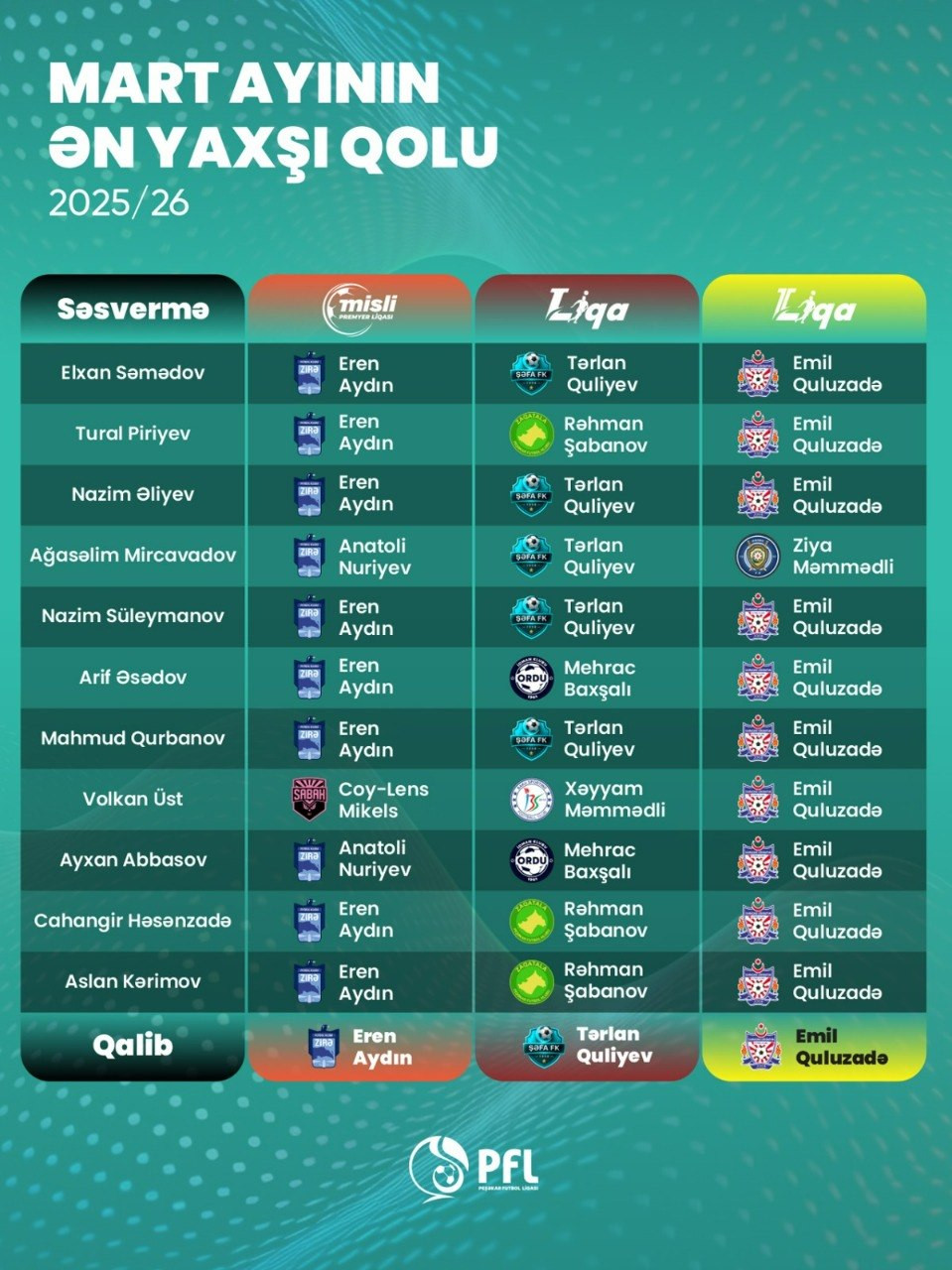 Münsiflər heyətinin səsinə əsasən, Misli Premyer Liqasında “Zirə”in futbolçusu Eren Aydın, Birinci Liqada “Şəfa”ın oyunçusu Tərlan Quliyev və İkinci Liqada “Qaradağ Lökbatan”ın futbolçusu Emil Quluzadə birinci olub.