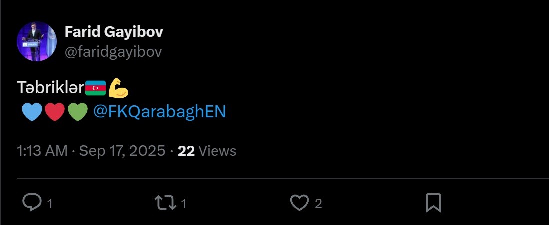 Gənclər və idman naziri Fərid Qayıbov "Qarabağ"ı UEFA Çempionlar Liqasının əsas mərhələsində qazandığı qələbə münasibətilə təbrik edib.