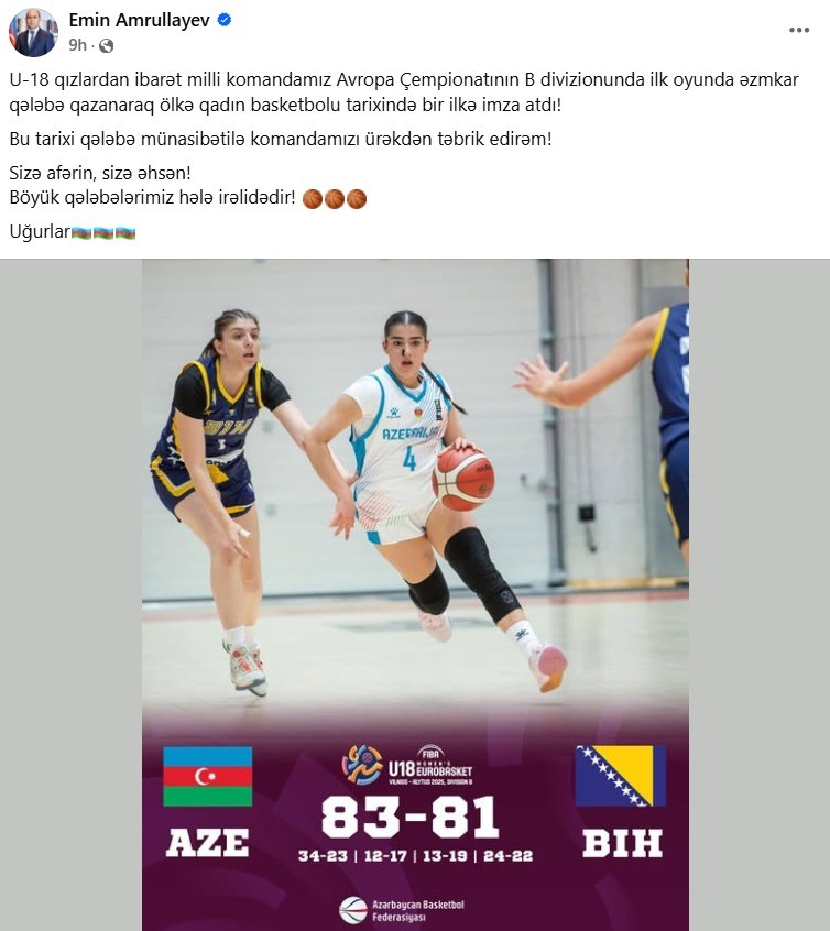 İdman.biz xəbər verir ki, bu barədə Azərbaycan Basketbol Federasiyasının prezidenti Emin Əmrullayev sosial şəbəkə hesabında paylaşım edib.