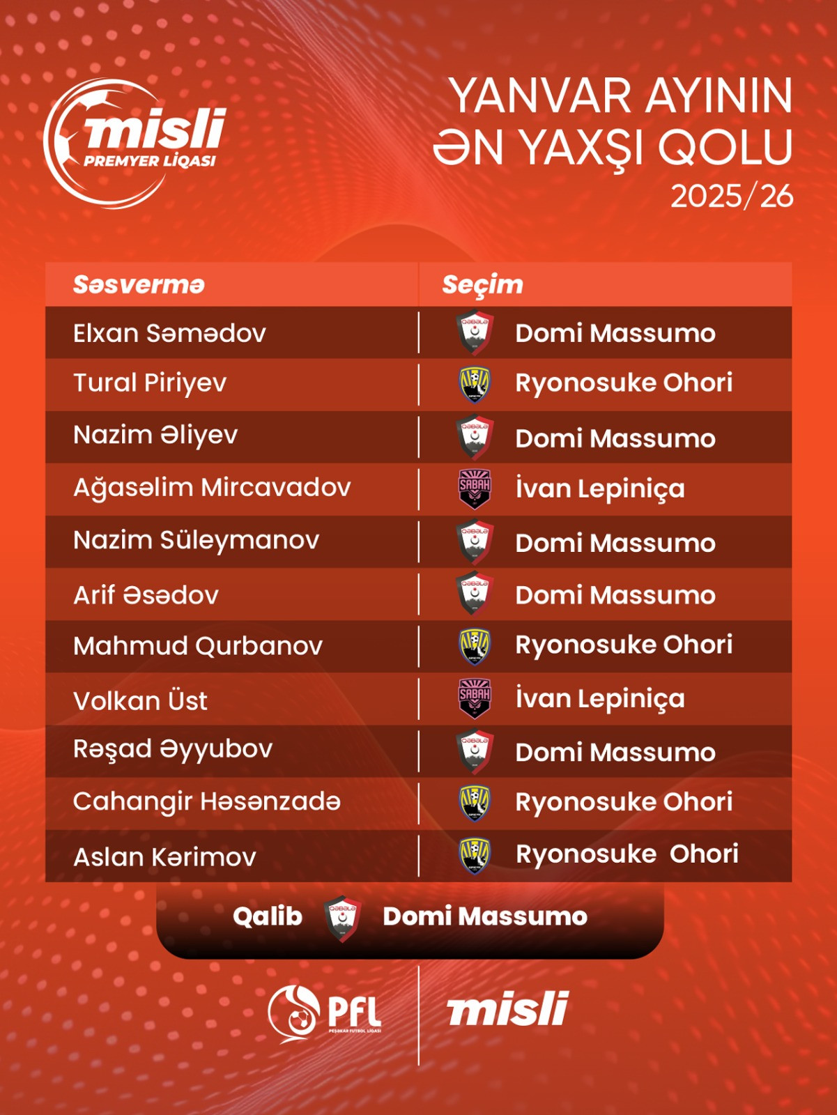 2025/2026 mövsümündə Misli Premyer Liqası üzrə “Ayın qolu” layihəsində yanvar ayının qalibləri müəyyənləşib.