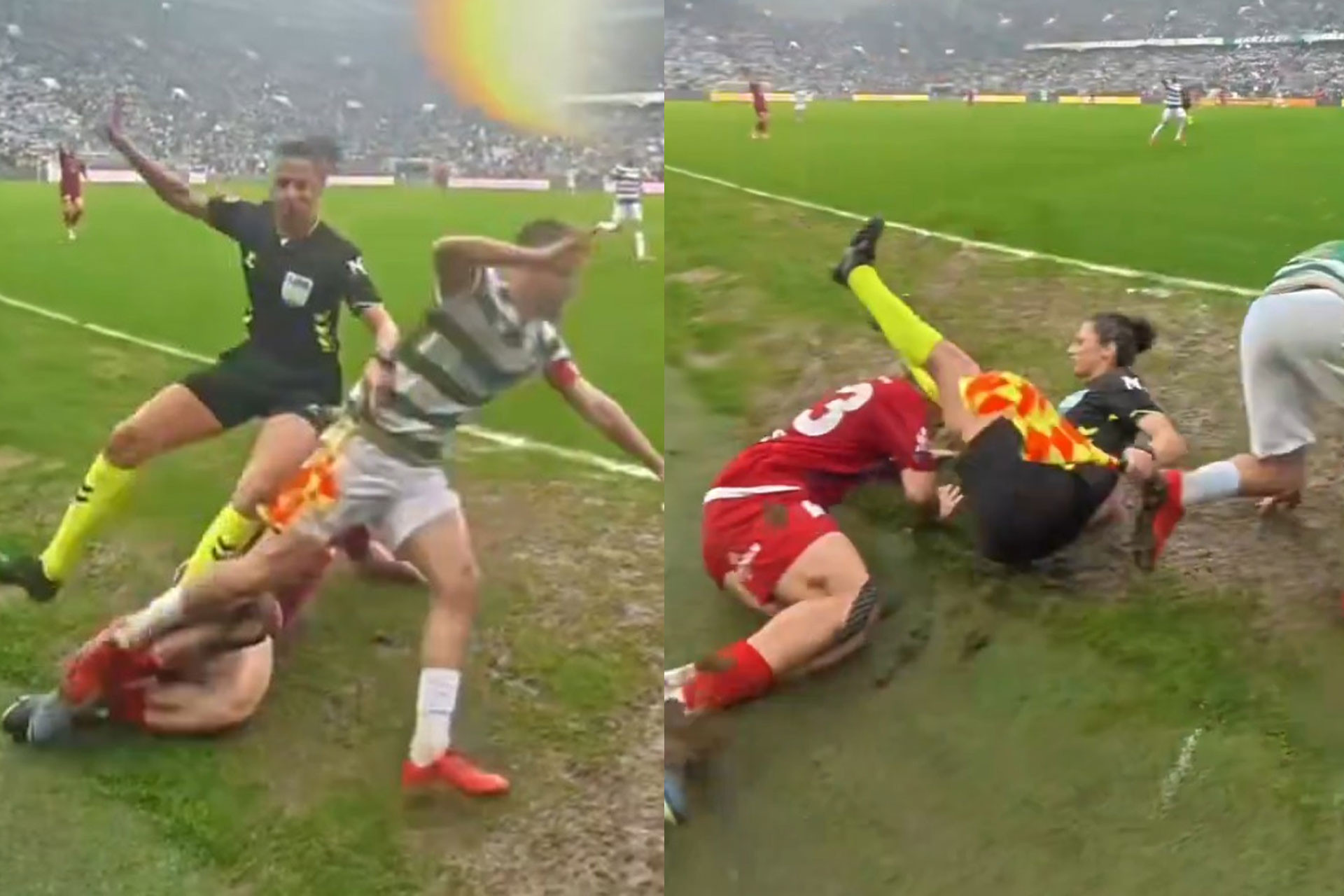 İdman.Biz xəbər verir ki, qarşılaşma əsnasında qadın hakim köməkçisi Esra Arıkboğa uğursuz şəkildə yerə yıxılıb. Belə ki, futbolçular yan xətt yaxınlığında topla mübarizə zamanı sürüşmə fəndi yerinə yetirərkən meydandan kənara çıxıblar və hakimlə toqquşublar.