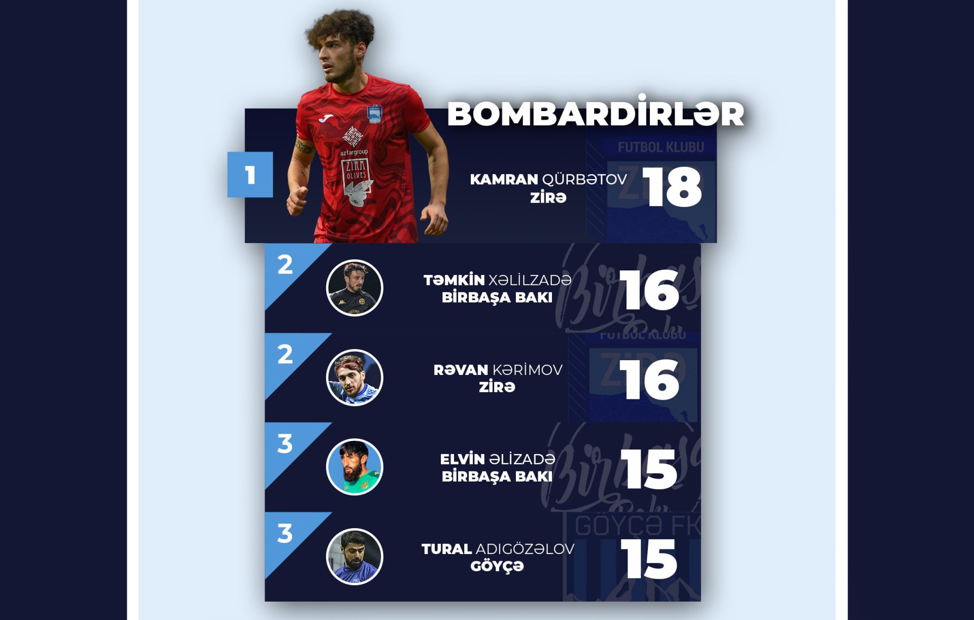 Siyahıya Kamran Qürbətov başçılıq edir. “Zirə”nin bombardiri 18 dəfə fərqlənib.