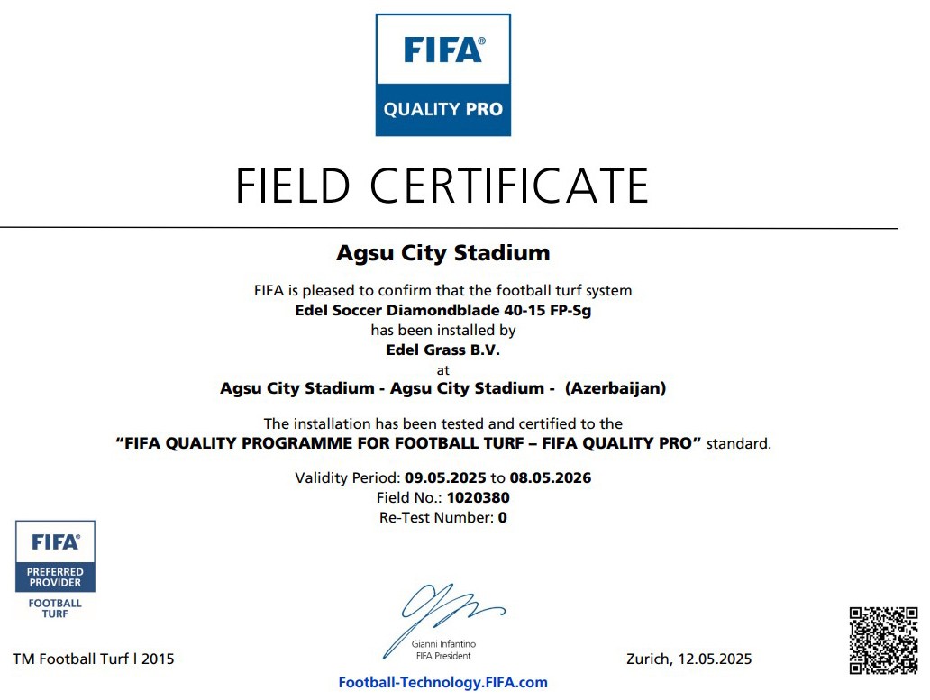 Ağsu şəhər stadionunda quraşdırılmış süni ot örtüyü FİFA tərəfindən “Quality Pro” sertifikatına layiq görülüb. Bu keyfiyyət nişanı stadionunda beynəlxalq oyunların keçirilməsinə imkan verir.