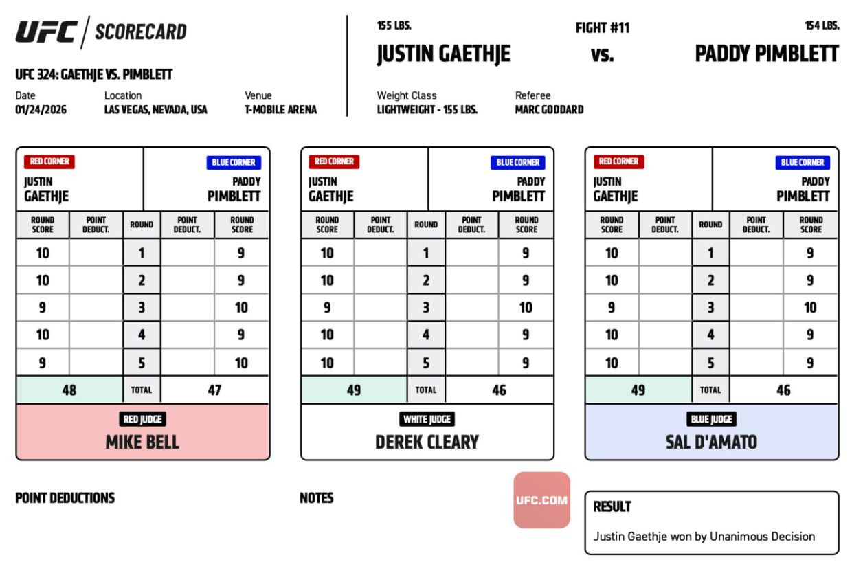 Döyüşdən sonra açıqlanan hakim protokollarına əsasən, iki referi Qetjiyə beş raunddan dördündə üstünlük verib – birinci, ikinci, dördüncü və beşinci raundlar 10:9 hesabı ilə amerikalıya yazılıb. Üçüncü hakim də eyni qiymətləndirməni aparıb, yalnız beşinci raundu 10:9 hesabı ilə Pimblettin xeyrinə qeyd edib.