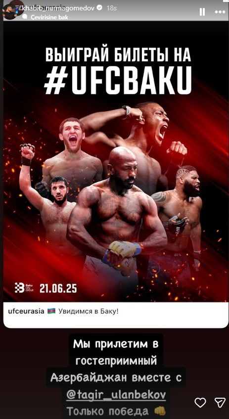 İdman.biz xəbər verir ki, bunu Həbib Nurməhəmmədov Bakıda keçiriləcək UFC turniri ilə bağlı paylaşımında yazıb.