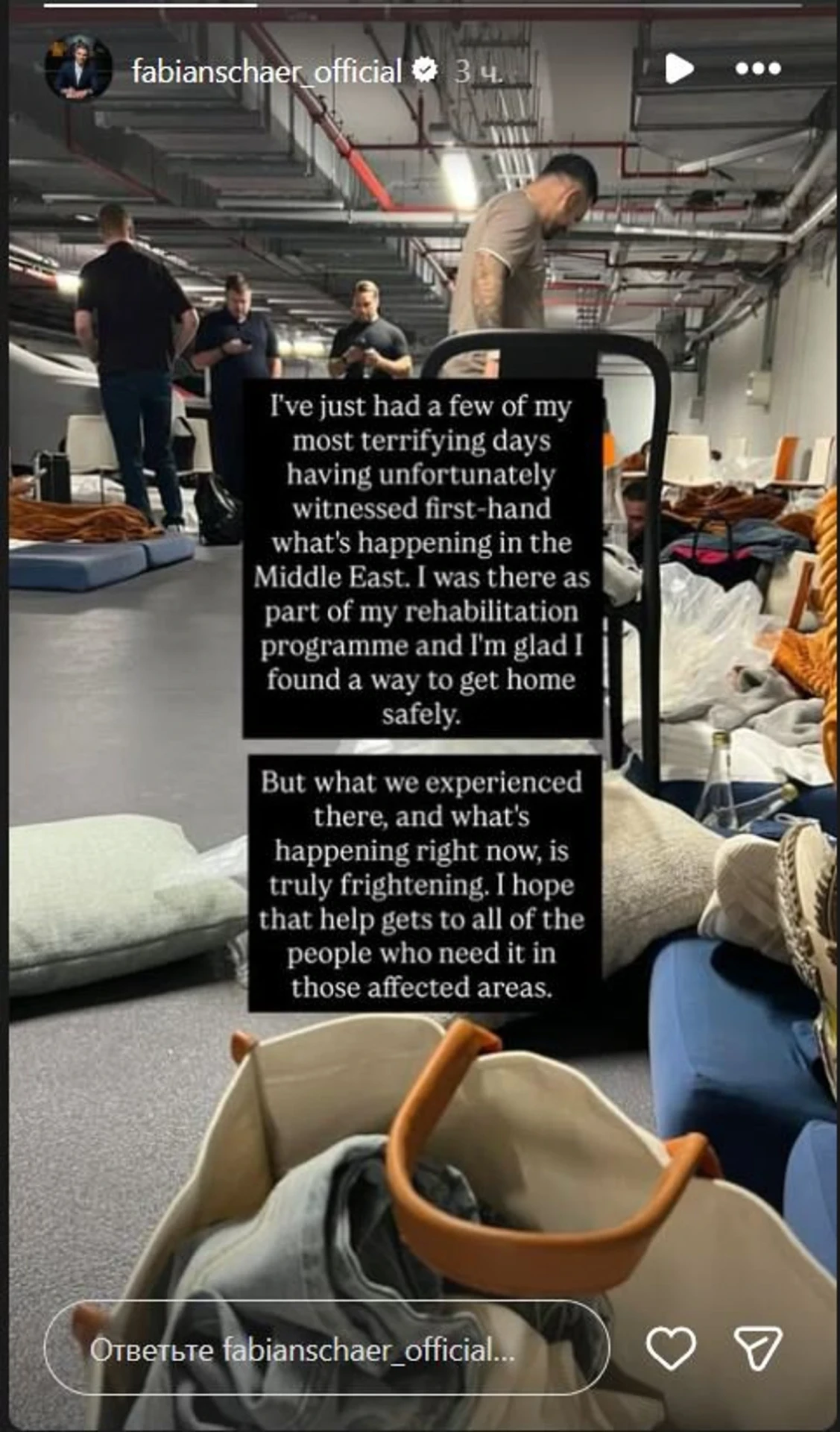 Zədədən sonra BƏƏ-də reabilitasiya keçən 34 yaşlı futbolçu İnstaqram-da başqaları ilə birlikdə sığınacaqda çəkdirdiyi şəklini paylaşıb.
