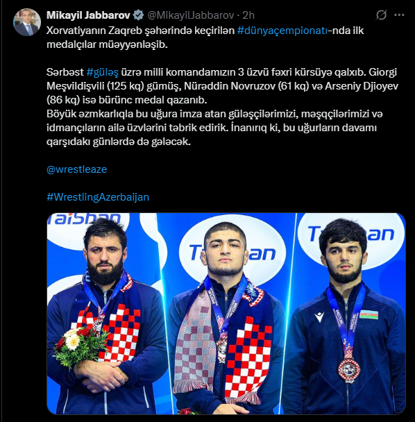 Mikayıl Cabbarov bu uğurun davamlı olacağına inandığını vurğulayıb: "Xorvatiyanın Zaqreb şəhərində keçirilən dünya çempionatında ilk medalçılar müəyyənləşib. Sərbəst güləş üzrə milli komandamızın 3 üzvü fəxri kürsüyə qalxıb. Giorgi Meşvildişvili (125 kq) gümüş, Nürəddin Novruzov (61 kq) və Arseniy Djioyev (86 kq) isə bürünc medal qazanıb. Böyük əzmkarlıqla bu uğura imza atan güləşçilərimizi, məşqçilərimizi və idmançıların ailə üzvlərini təbrik edirik. İnanırıq ki, bu uğurların davamı qarşıdakı günlərdə də gələcək", - deyə federasiya rəhbəri bildirib.