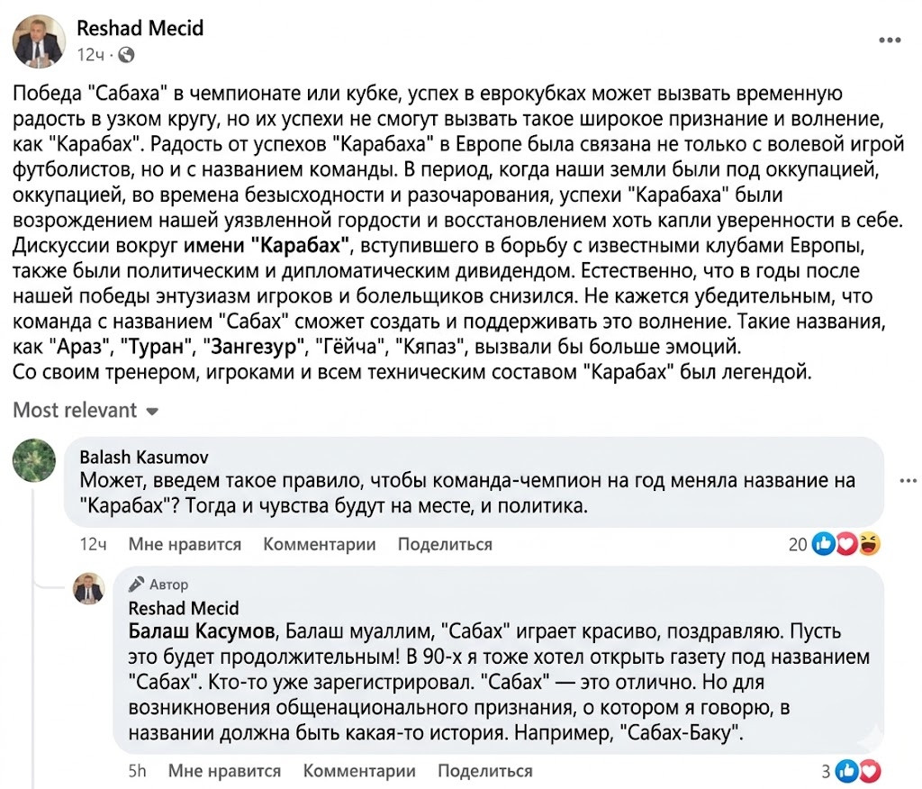 После резонансного противостояния "Сабаха" и "Карабаха" в Кубке Азербайджана между председателем Совета прессы Азербайджана Рашадом Меджидом и вице-президентом Ассоциации футбольных федераций Азербайджана (АФФА) Балакиши Гасымовым разгорелся спор в соцсетях о статусе и восприятии клубов.