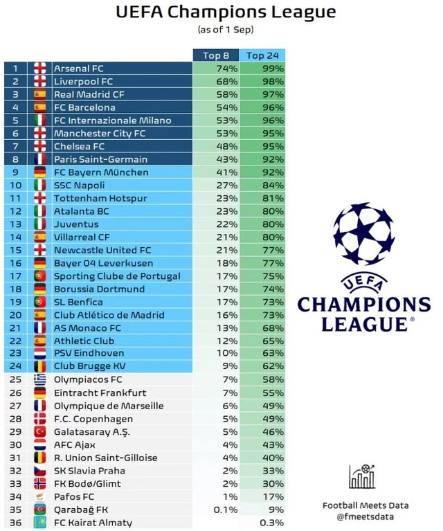 По сравнению с чемпионом Азербайджана ниже шансы только у “Кайрата”. Представитель Казахстана, согласно прогнозу Football Meets Data, не имеющий шансов на попадание в топ-8, может попасть в топ-24 с вероятностью в 0,3 процента.