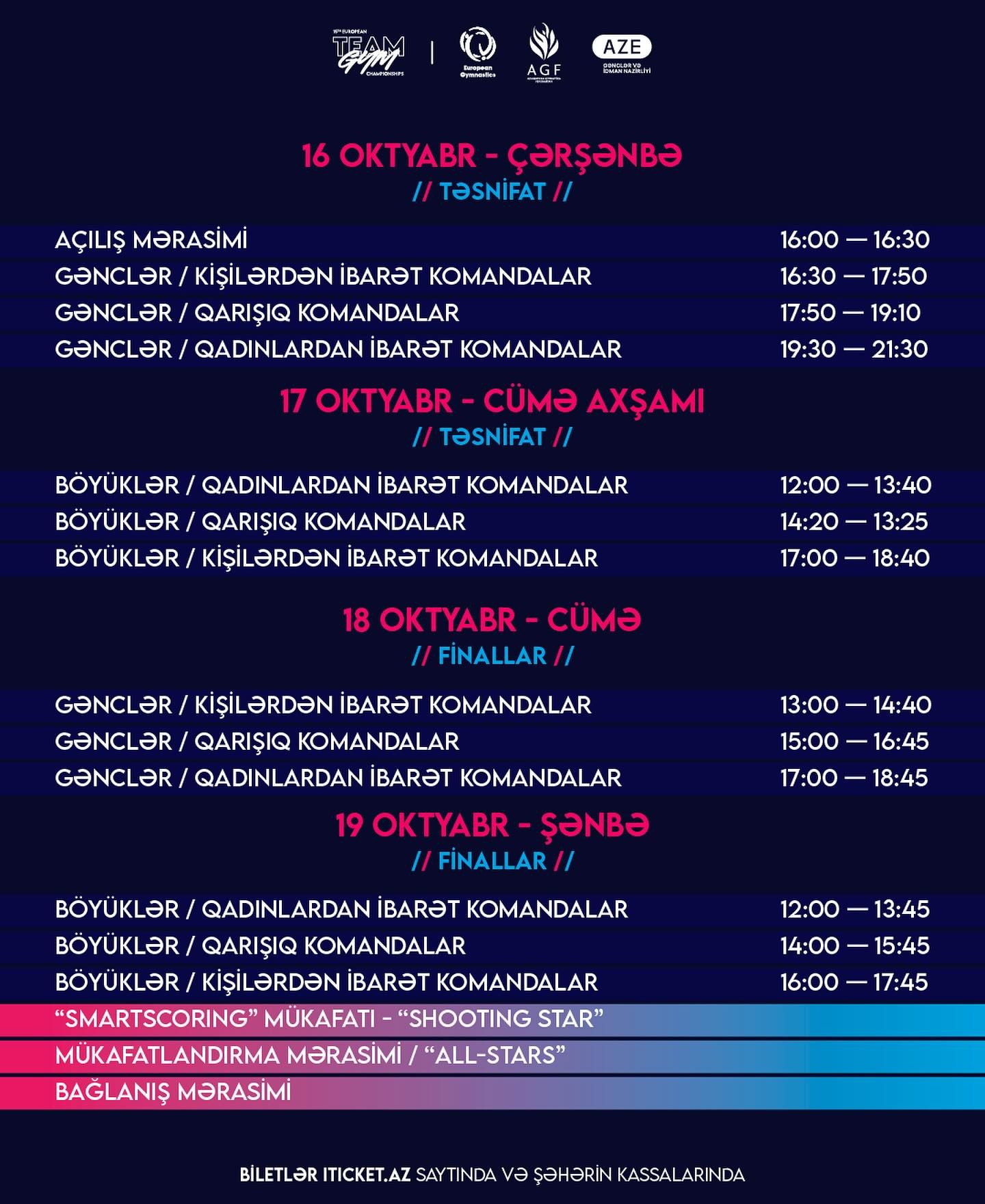 Опубликовано расписание чемпионата Европы по TeamGym, который пройдет 16-19 октября в Баку.