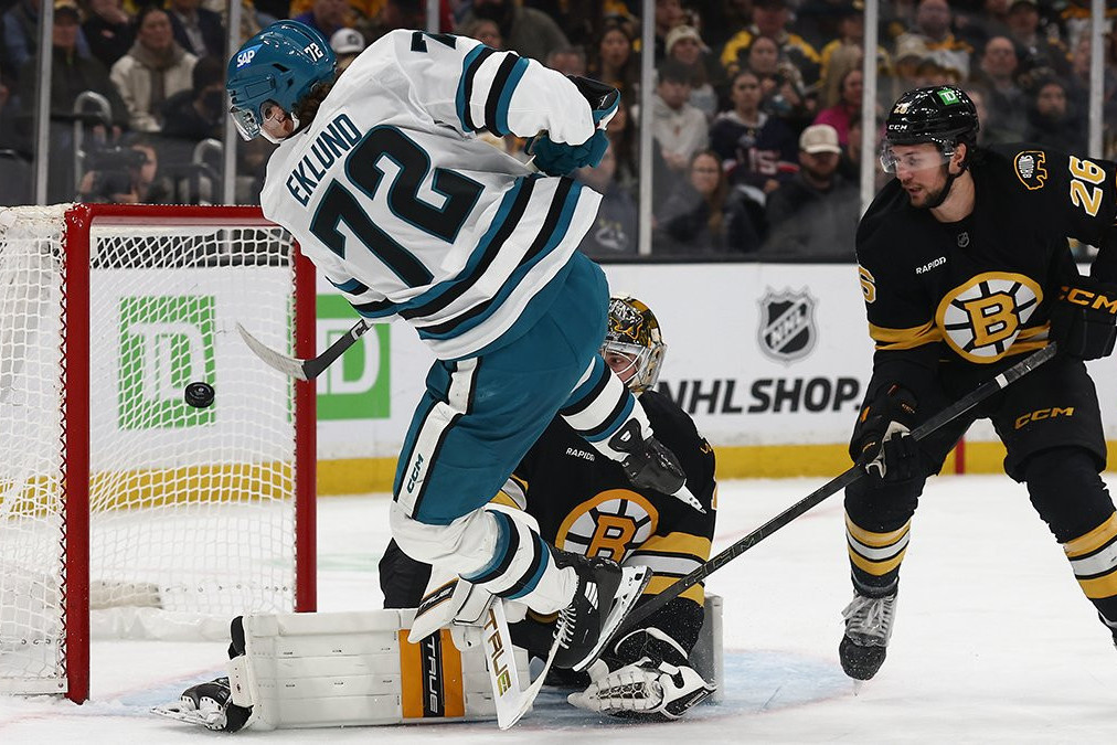 В матче НХЛ между "Сан-Хосе Шаркс" и "Бостон Брюинз" был забит гол, который мгновенно стал вирусным.