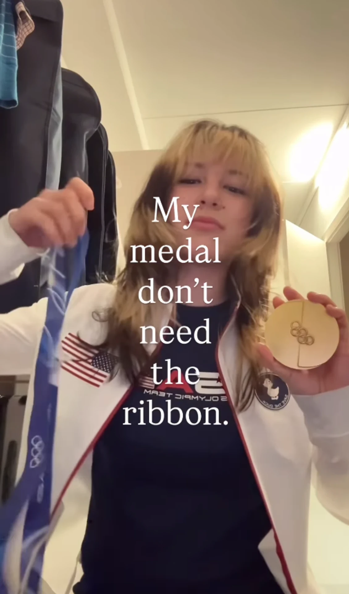 Сама фигуристка отнеслась к случившемуся с иронией, прокомментировав ситуацию в социальных сетях фразой: "Моей медали лента и не нужна".