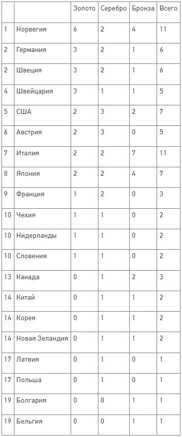 Лидером медального зачета после четырех дней соревнований является Норвегия с шестью золотыми наградами, одной серебряной и четырьмя бронзовыми медалями. Второе место делят Германия и Швеция — у них по три "золота", два "серебра" и одной "бронзе".