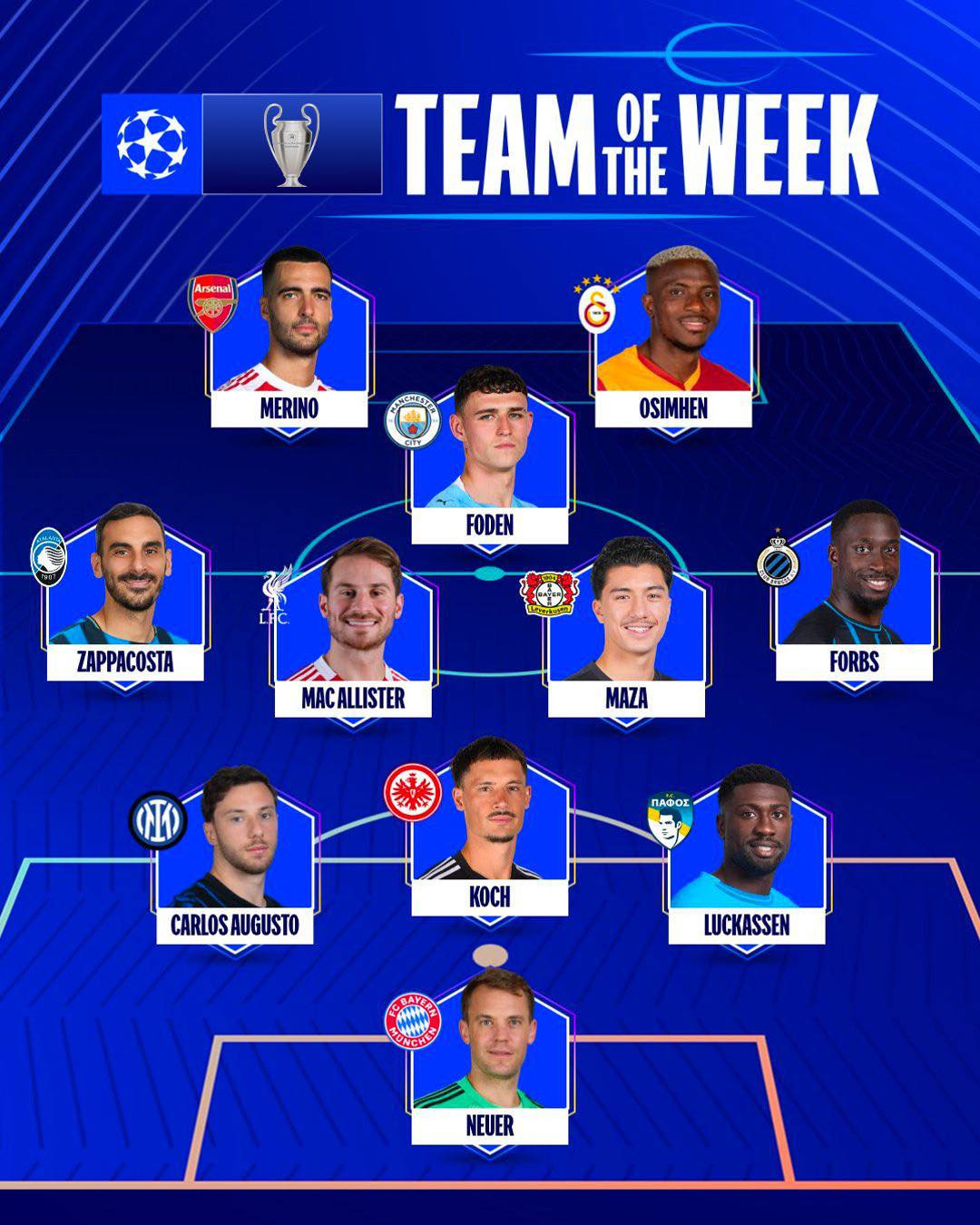 Союз европейских футбольных ассоциаций (УЕФА) на своей странице в социальной сети X представил символическую команду из лучших футболистов нынешней недели Лиги чемпионов.