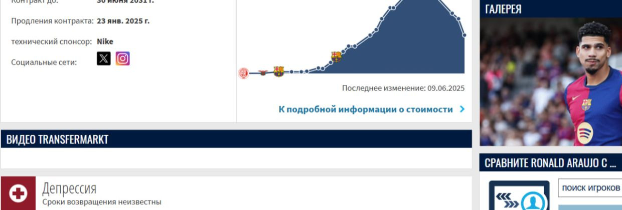 На портале Transfermarkt в разделе травм защитника "Барселоны" Рональда Араухо указано, что футболист недоступен для участия в ближайших матчах из-за депрессии. Об этом сообщает издание, ссылаясь на обновленные данные ресурса, сообщает İdman.Biz.