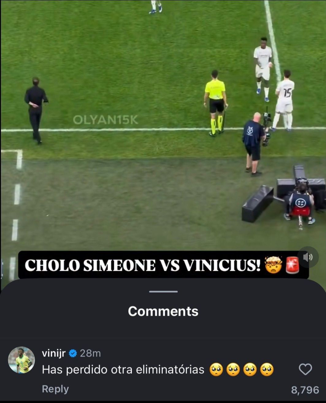 Как сообщает İdman.Biz, после игры бразильский футболист оставил комментарий под постом журналиста Фабрицио Романо в социальной сети, где было опубликовано видео стычки Винисиуса с Симеоне. Игрок "Реала" написал: "Опять проиграл матч на вылет", - сопроводив сообщение грустными эмодзи.