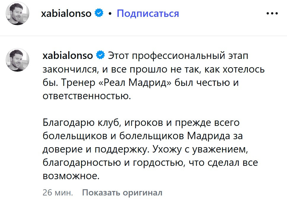 Как сообщает İdman.Biz, испанский специалист опубликовал в Instagram пост, поделившись мыслями о прошедшем этапе карьеры. Алонсо отметил, что этот период сложился не так, как он рассчитывал, однако подчеркнул, что работа в стане "сливочных" стала для него большой честью и серьезной ответственностью.