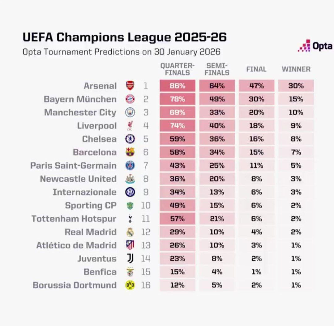 Аналитическая компания Opta опубликовала обновленный прогноз на исход Лиги чемпионов УЕФА 2025/26.