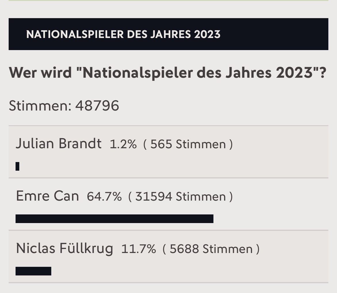 По информации источника, Джан сильно опережает ближайших конкурентов в борьбе за награду - за Эмре отдали свои голоса 64,7% пользователей, принявших участие в определяющем лучшего игрока голосовании. Отметим, что в нынешнем сезоне 30-летний полузащитник «шмелей» провёл 13 игр в рамках Бундеслиги, забил один гол и сделал две результативные передачи.