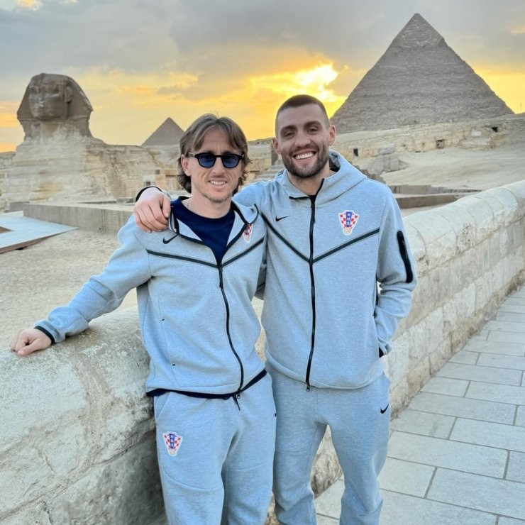 Футболисты сборной Хорватии Лука Модрич и Матео Ковачич сфотографировались на фоне египетских пирамид. Уже скоро им придется столкнуться друг с другом на футбольном поле.