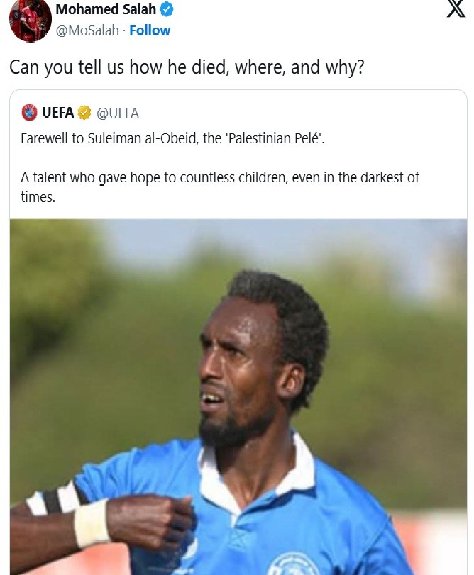 Форвард "Ливерпуля" Мохамед Салах публично отреагировал на публикацию УЕФА, посвященную памяти палестинского футболиста Сулеймана аль-Обейда, известного как "палестинский Пеле".